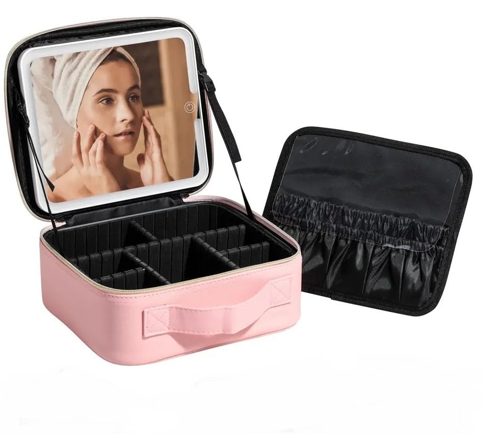 - Makeup bag with LED mirror for on-the-go touch-ups: switch between 3 light modes and adjust brightness so your eyeliner stays sharp in the car, office, or university restroom.