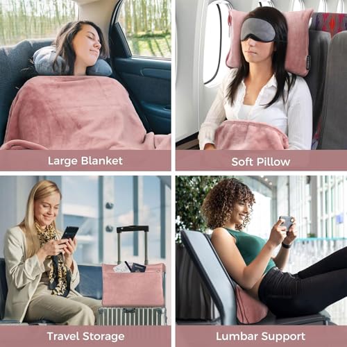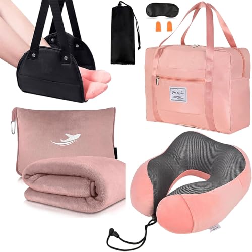 KAPEICamper - Travel Pillow and Blanket Set & Foot Rest, Memory Foam Neck Pillow Airplane Blanket & Airplane Foot Hammock & Foldable Duffel Bag, Eye Mask & Earplugs, Portable Travel Accessories Essentials (Pink)