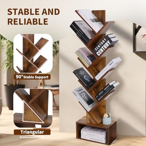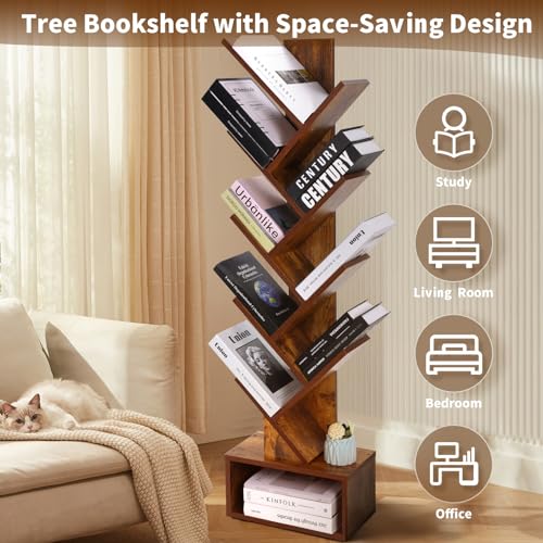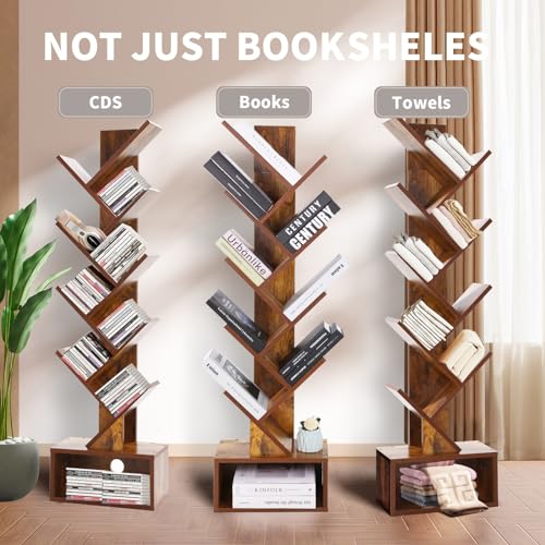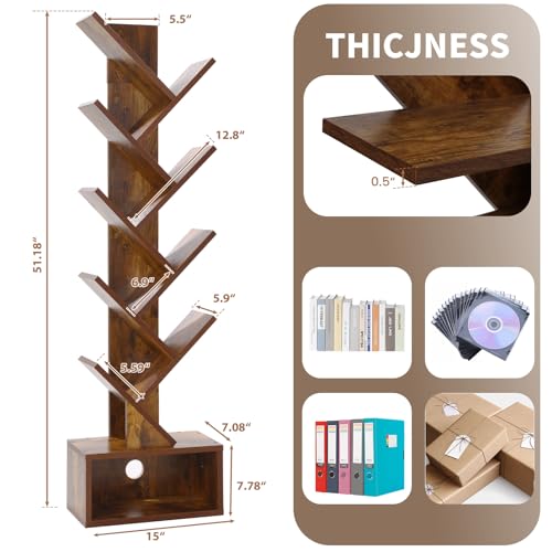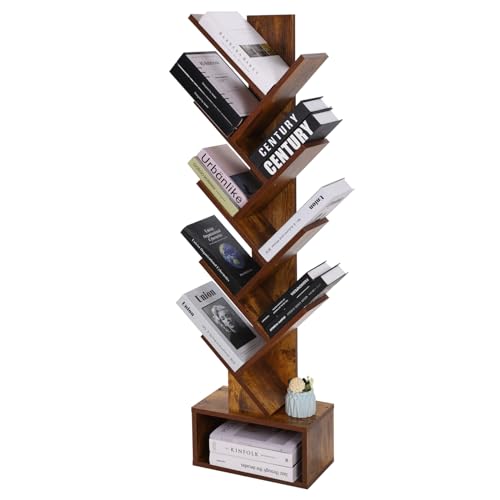 PRODUCTSSI - Tree Bookshelf 8 Shelf with Drawer Retro Floor Standing Bookcase, Tall Wood Book Storage Rack for CDs/Movies/Books, Utility Book Organizer Shelves for Bedroom, Living Room, Home Office Rustic Brown