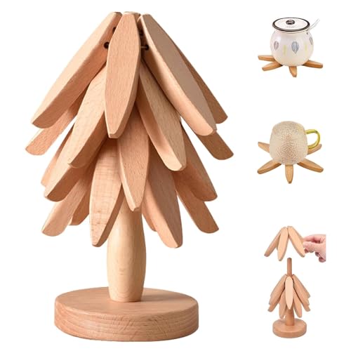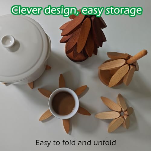 - 【Automatic Folding】This is a set of wooden tree trivet set that can be folded automatically and consists of 3 or 4 small wooden pieces. Take a piece from the stand and place it directly on the tabletop, you can arrange the tableware from top to bottom without having to flatten it beforehand. It unfolds automatically due to gravity. When not in use, it can be compactly stored away, saving you space in the kitchen