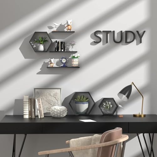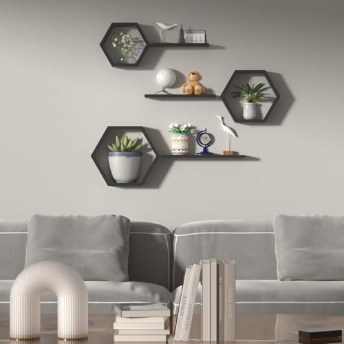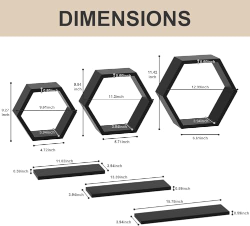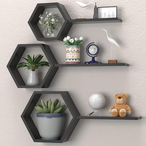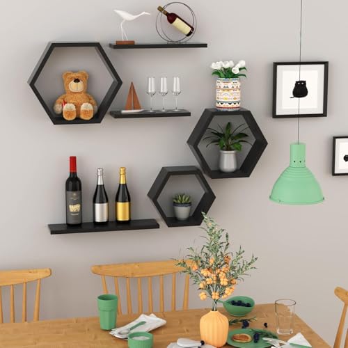 TrendAtoZ - Wooden Hexagonal Floating Wall Shelves, Wall Mounted Set Of 6 Accent Display Shelves For Books, Plants, Photos | Decorative Kitchen Shelves For Living Room, Bedroom, Bathroom (Black)