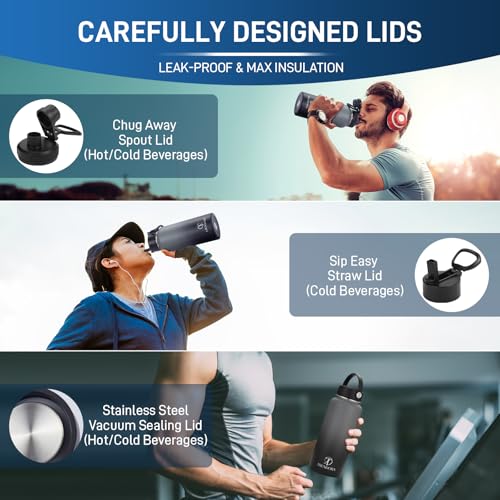 - WATER BOTTLE WITH STRAW AND LEAKPROOF LIDS: Our sports water bottle is equipped with 2 lids: 1 flip-up straw lid, 1 easy-twist spout lid. All caps allow for easy one-handed or hands-free sipping when you are busy or on-the-go