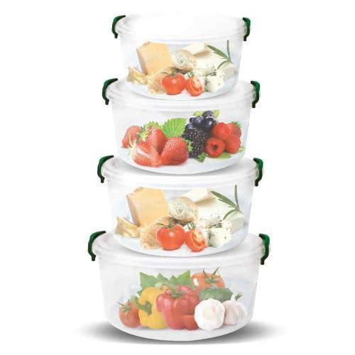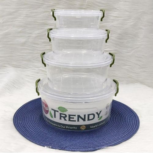 Generic - Trendy Round Refrigerator Storage Containers, Plastic, 4 Pieces, Clear with Green Handles, Multi Sizes 3.2L, 2L, 1.1L, 500ml