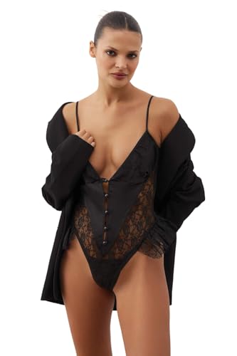 Trendyol - Trendyol Black Lace and Satin Ruffled Capless Fancy Bodysuit with a Marriage Thmaw26Bd00003,Black L