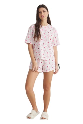 Trendyol - طقم بيجامة محبوك من قماش جيرسي مطبوع لون وردي فاتح للنساء، THMSS25PT00160 من تريندول