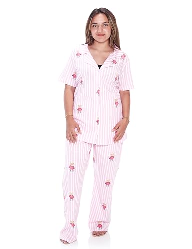 Trendyol - Trendyol Woman Pink Striped Teddy Bear Patterned Shirt Collar Knitted Pajama Set TBBAW25AI00039 Plus Size Pajama Set