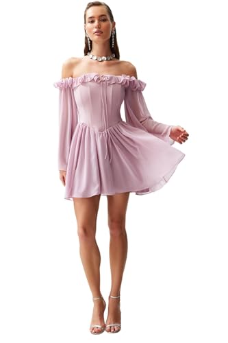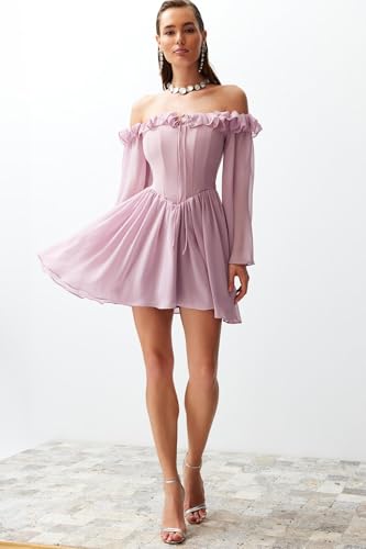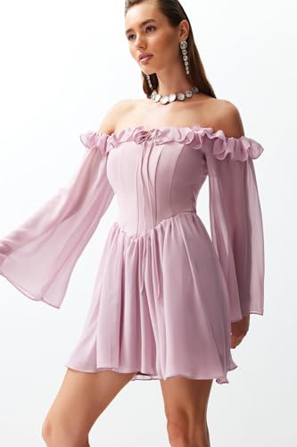 Trendyol - فستان سهرة قصير بكسرات واسعة طراز TPRSS23EL00096 أنيق بقصة ايه لاين من الشيفون بنسيج محبوك مع بطانة من ترينديول