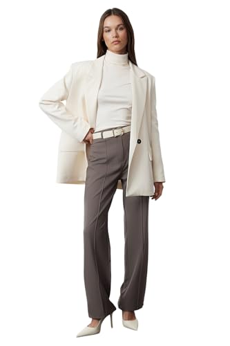 Trendyol - بنطلون بقصة مستقيمة وخصر مرتفع منسوج بنسيج مضلع للنساء TWOSS21PL0093 من ترنديول
