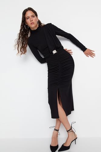 Trendyol - Trendyol Womens Black Fitted/Fitted Stand Collar Draped Belt Flexible Knitted Pencil Dress TWOAW22EL0434 Dress