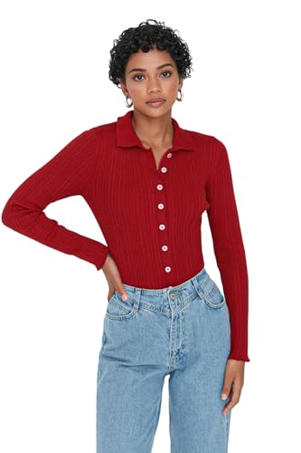 Trendyol - ترنديول كارديجان محبوك برقبة بولو مضلعة للنساء بلون بورغندي Twoaw20Hi0070 (عبوة من قطعة واحدة)