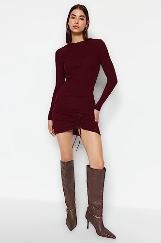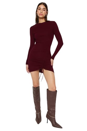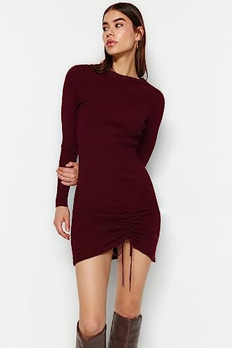Trendyol - ترنديول فستان قصير محبوك للنساء بلون احمر كلاريت - فستان بتفاصيل مجمعة Twoaw23El00443 (عبوة من قطعة واحدة)