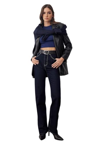 Trendyol - بنطلون جينز طراز Twoaw26Je00025 بخصر عالي وتصميم مستقيم للنساء من ترينديول، لون أزرق غامق، عبوة من قطعة واحدة
