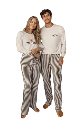 Ecru Color Women's Couple Pajamas Set - 100% Cotton with Stripe and Teddy Bear Thmaw25Pt00171