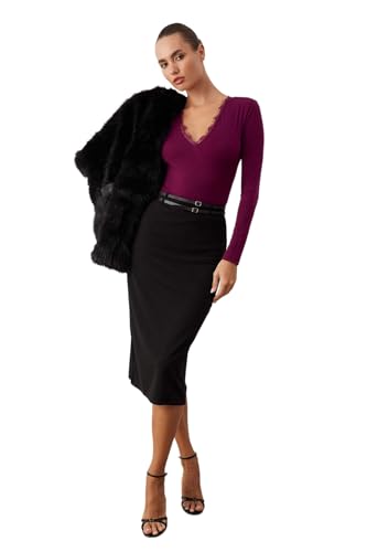 Trendyol - Trendyol Womens Plum Plain V-Neck Long Lace Detail Bottom Snap Knitted Sandy Stylish/Night Body Tpraw25Bd00007 Bodysuit (pack of 1)