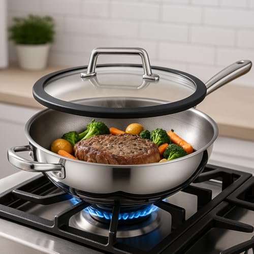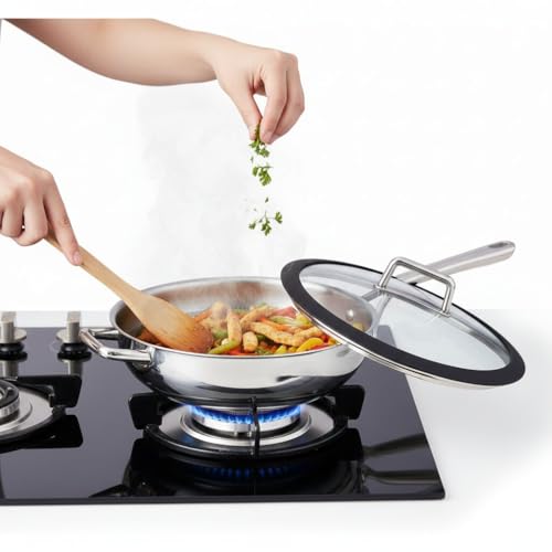 - Flat glass lid with tight silicone rim keeps heat and steam, prevents driping, and supports all cooking methods: browning, steam, fast frying, sute.