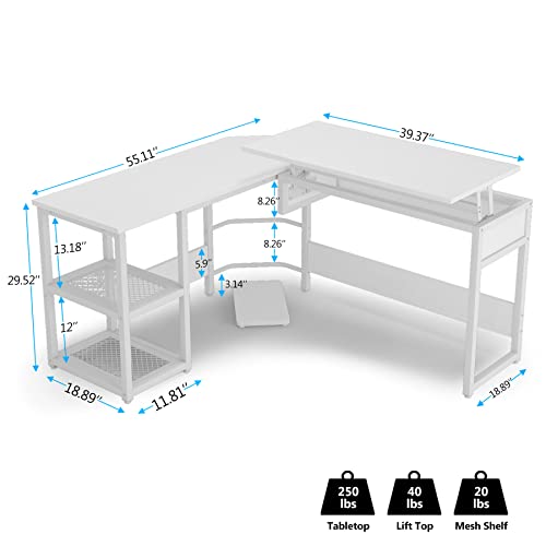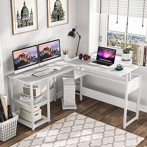 Tribesigns - Tribesigns L Shaped Desk with Lift Top, Modern Sit to Stand Corner Computer Desk with Storage Shelves, Rustic Height Adjustable Standing Desk Workstation for Home Office (White)