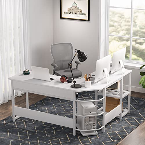 - AMPLE STORAGE & CPU STAND: The spacious L-shaped desktops provides you with a abundance of workspace for your multiple monitors, laptop and other office supplies; while 2 storage shelves under the left side keep your files and books well organized and easy to access. Come with a free CPU stand to place your computer host