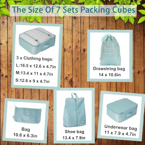 - WHAT’S INCLUDED (7 PCS)--1 × Extra Large Packing Cube-16.5 × 12.6 × 4.7 In — Shirts, Pants, Jackets & Dresses, 1 × Large Packing Cube-13.4 × 11 × 4.7 In — T-Shirts, Trousers & Light Sweaters, 1 × Medium Packing Cube-13.4 × 9 × 4.7 In — Shorts, Skirts & Kids’ Clothes, 1 × Underwear Bag-11 × 7.9 × 4.7 In — Bras, Underwear, Socks & Innerwear, 1 × Toiletry Bag -10.6 × 6.3 In — Toiletries, Shaving Kit, Electronic Accessories, 1 × Laundry Bag-14 × 10.6 In — Separate Dirty Clothes While You Travel. 1 × Shoes Bag-14.5 × 7.8 In — Fits 1 Pair Of Sneakers + 1 Pair Of Slippers