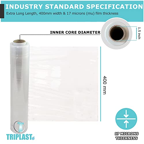 Triplast - Triplast 1 Roll x 400mm Clear Pallet Stretch Wrap | Standard Core, 17mu Thick, Industrial Strength | Shrink Wrap, Cling Film, Plastic Wrap | Packaging for Removals, Industrial & Warehouse Use