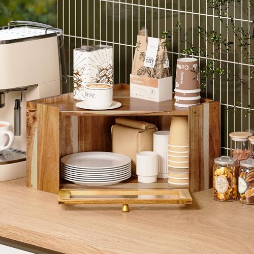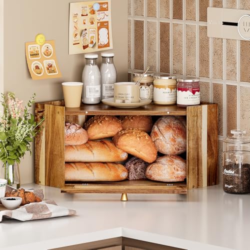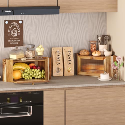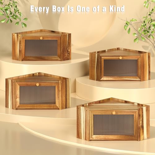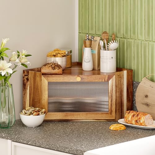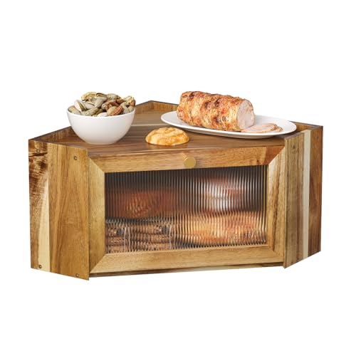 Trironsun - صندوق خبز من خشب الاكاسيا انيق من الخيزران من تريرونسون صن لطاولة المطبخ، حاوية تخزين خبز ريفية ذات سعة كبيرة مع باب شفاف مموج من ارسيليك للخبز المنزلي (خشب اكاسيا)