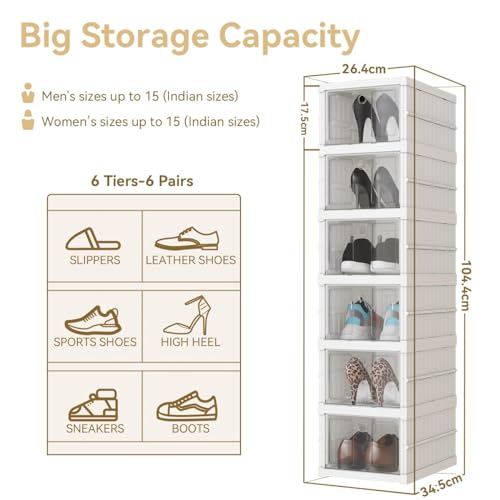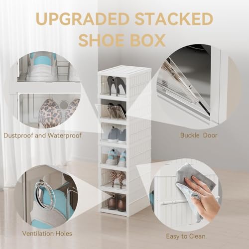 TRIVESH - Drop Front Foldable Shoe Organizer Storage Box - Collapsible Shoe Rack, Clear-Door Design for Effortless Shoe Management in Closet and Entryway Foldable Sneaker Crates (6 Tier)