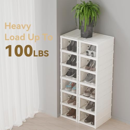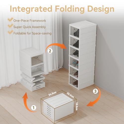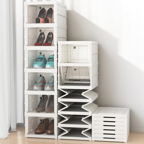 - SNEAKER BOX: These sneaker rack for home is amazing and comes in white color for keeping your shoes organized. The elegant clear front door can be easily opened & closed, allows your shoes to be displayed and find the right shoes easily without opening all the boxes. Perfect for sneakers, flats, flip-flops, sandals, sport shoes, loafers and wedges. The foldable design allows you to fold and unfold it anytime, and avoids occupying space