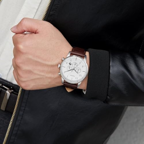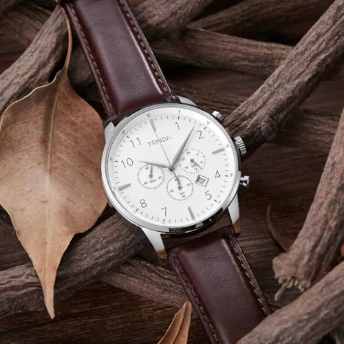 TRNDA - STAINLESS STEEL CLASSIC - TIMELESS MEN'S WATCH WITH BROWN LEATHER BAND & SILVER WHITE DIAL