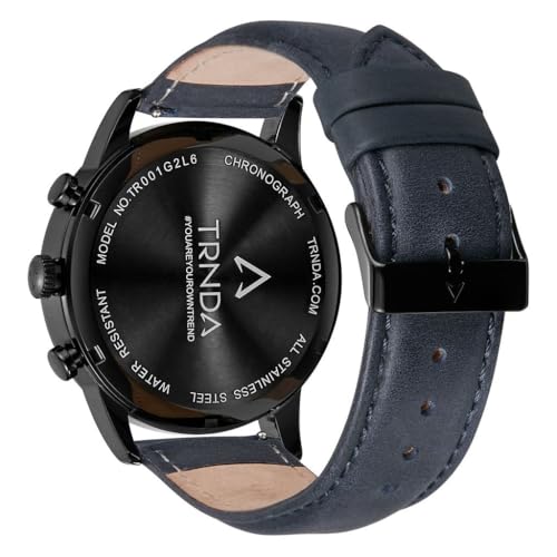TRNDA - ساعة فولاذ مقاوم للصدأ للرجال من ترندا - مينا أسود تايمليس وأزرق مع سوار جلد طبيعي
