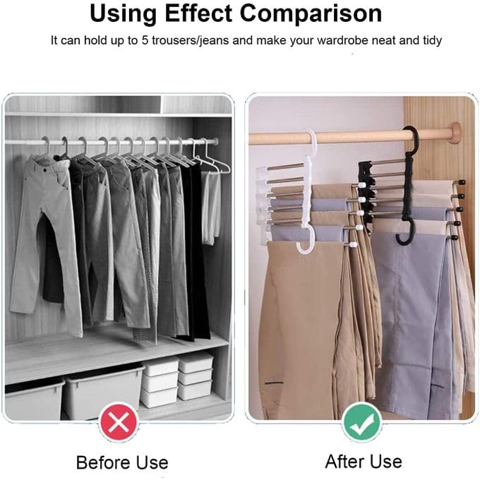 - The 5-in-1 trouser holder is the perfect solution to organize your closet, allowing you to store up to 5 pants at a time, saving you up to 80% space in your closet. Constructed of stainless steel and plastic, this stand is durable and easy to use.