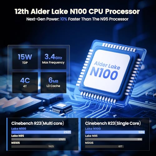 - سريع وقوي الجيل الثاني عشر N100 - مجهز بأحدث وحدة معالجة الرسومات الجرافيكية 24 EU، وتردد توربو يصل إلى 3.4 جيجاهرتز، استهلاك طاقة أقل من N97 وN150، وأداء أسرع بنسبة 20% من N95، يتميز كمبيوتر تريكو N100 الصغير بذاكرة تخزين مؤقت 4C/4T، 6MB L3 وذاكرة تخزين مؤقت 15 واط TDP (6 ميجابايت، 6 ميجابايت W الافتراضي ، تصميم 15 واط كحد أقصى)، مما يجعله مثاليًا للبث وتعدد المهام وتحرير التصميم الخفيف.