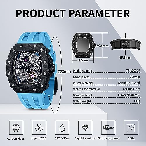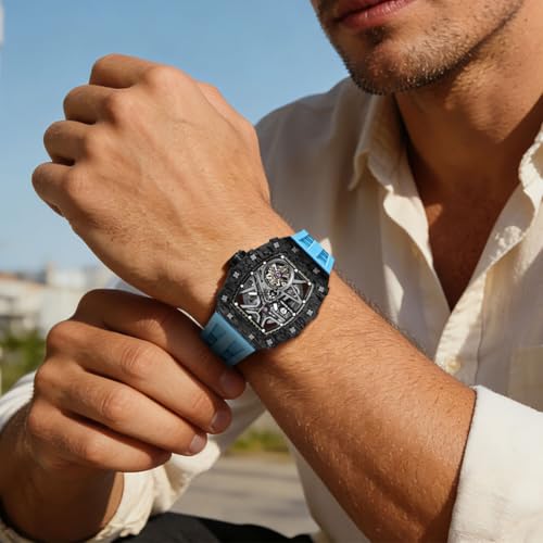 TSAR BOMBA - TSAR BOMBA Men's Watches Automatic Winding Watches for Men Tonneau Luxury Skeleton Original Design Watch Large Square Dial Wrist Watch Fluoro Rubber Strap Fashion Gift for Men