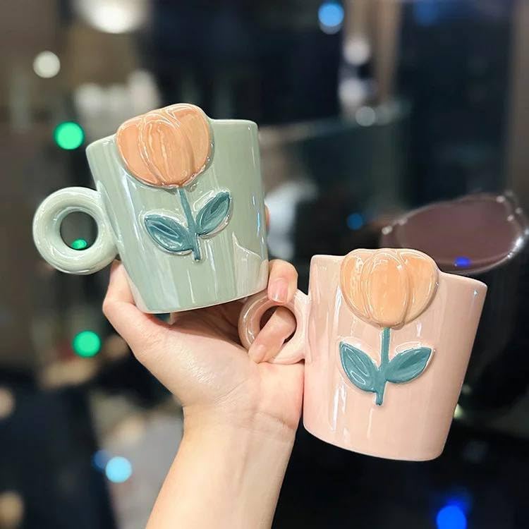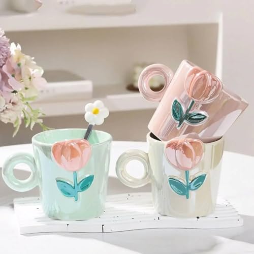 Generic - Tulip Flower Ceramic Mug Set, 3 Pieces, Pink and Mint Green