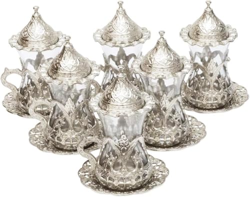 Generic - طقم شاي تركي مكون من 6 قطع بتصميم عثماني فضي مع اكواب شاي وصحون واغطية، هدية زفاف واحتفالات