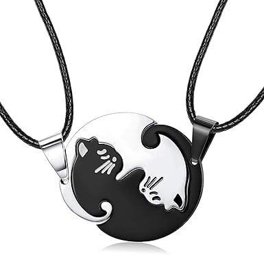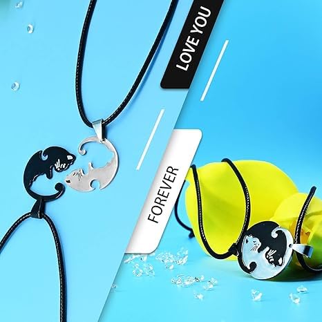 Generic - Two Necklace Cat Yin and Yang puzzle Couple Two Souls One Korean Fashion Men Women Teen Girls Lover, Boyfriend, Girlfriend, Confessions, Friendship -2 Pcs Black &Silver