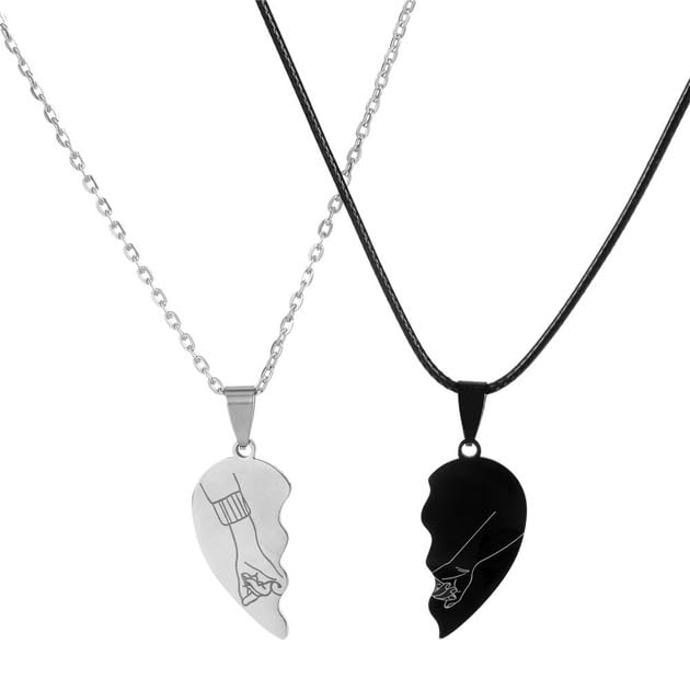 Generic - Two Necklace Heart Couple Two Souls One Korean Fashion Men Women Teen Girls Lover, Boyfriend, Girlfriend, -2 Pcs Stainless Steel Black &Silver