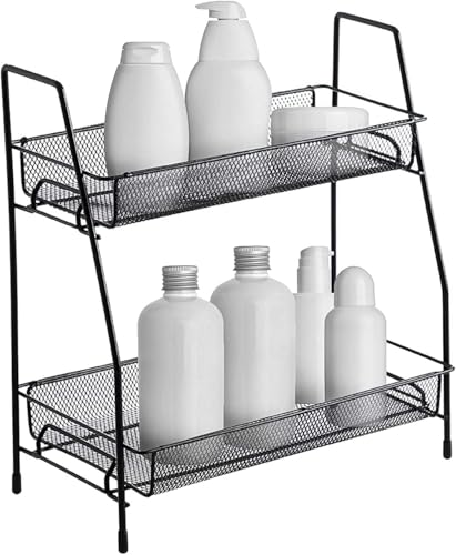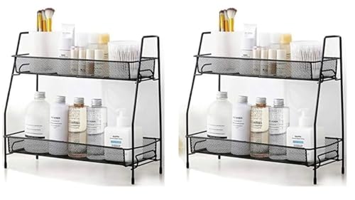 Generic - منظم رفوف تخزين معدني بطبقتين - رف حديدي شديد التحمل للمطبخ والحمام وغرفة المعيشة وطاولة الزينة | حامل منظم متعدد الاغراض لسطح الطاولة (اسود (عبوة من قطعتين)
