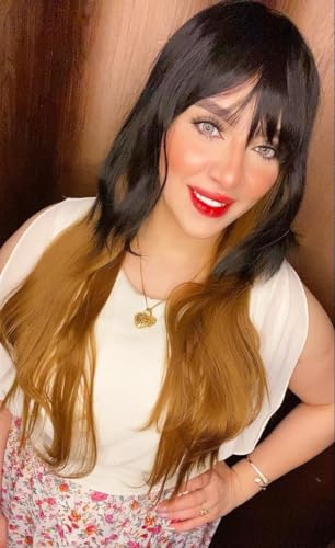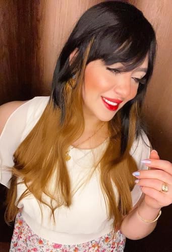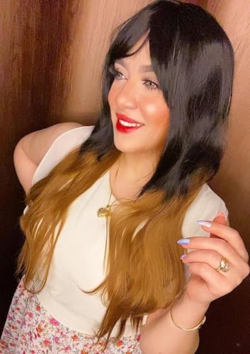 - STYLE FEATURES: Long straight synthetic wig featuring a striking two-tone ombre effect transitioning from black roots to caramel brown lengths with face-framing bangs