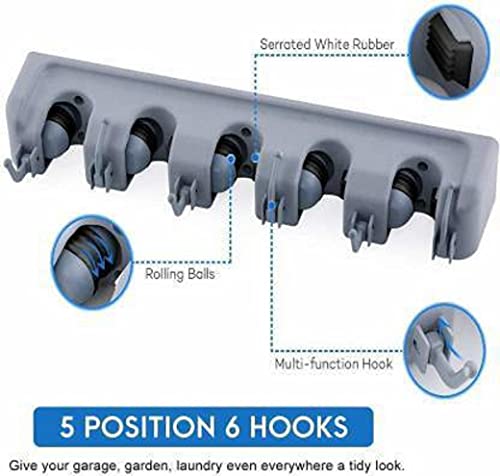 Twonzilla - Upgraded Plastic Mop and Broom Wall Mounted Holder with Effective Strong Holding 5 Slot Position with 6 Hooks Garage Storage upto 11 Tools Combo/Organize Ideas/Broom Holder