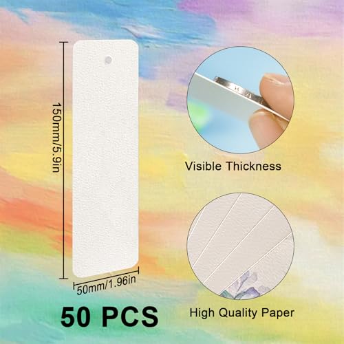 - قائمة محتويات العبوة: سوف تحصل على 50 ورقة ألوان مائية مستطيلة بمقاس 5 × 15 سم. تم تصميم كل بطاقة بريدية فارغة بفتحة صغيرة في الأعلى لتعليق الشراشيب وغيرها من الملحقات، مما يثري مشاريع الرسم اليومية الخاصة بك