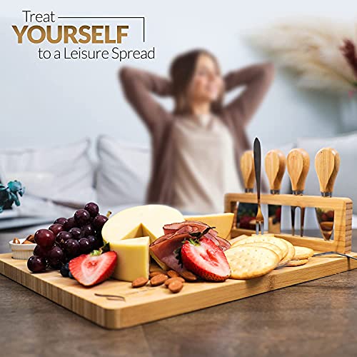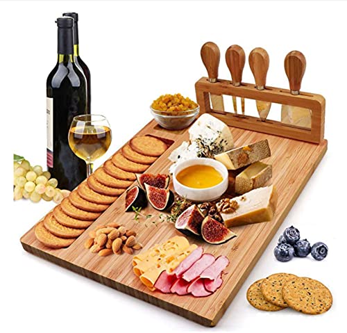 U-HOOME - U-HOOME Bamboo Cheese Board, Charcuterie Platter & Serving Tray Including 4 Stainless Steel Knife & Thick Wooden Server For er, Brie, Meat & Wine