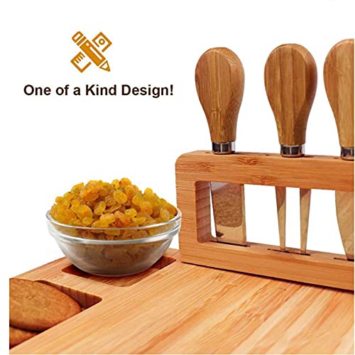 - ✔4 Stainless Steel Cheese Tools: Every cheese board set comes with premium cutting knives, includes everything you need to serve a variety of cheeses, soft Brie, crumbly blue, hard Parmesan, sharp cheddar,this set can handle them all.All utensils are crafted from high-quality kitchen grade stainless steel and bamboo handles.