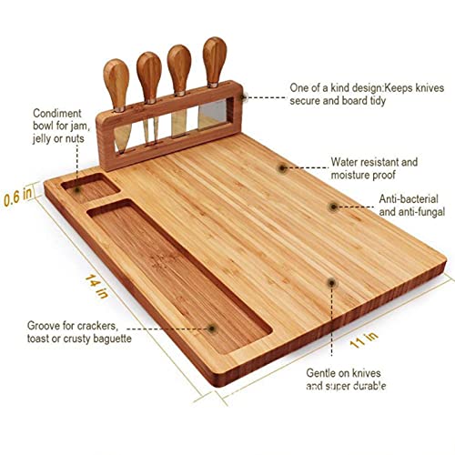 - ✔Innovative & Rational Design: Cheese board is used to serve cheese, appetizers, hors d'oeuvres, charcuterie (cured meats), nuts and other snacks.The groove is ideal for toast or crusty baguette and the ceramic bowl placement point is perfect for bowl with jam,nuts or dipping sauce.The unique vertical knife block will keep your cheese knives organized and display their true beauty.The size is 14”(L) X 11”(W) X 0.6” ( H ), and weight is (2.3Ib).