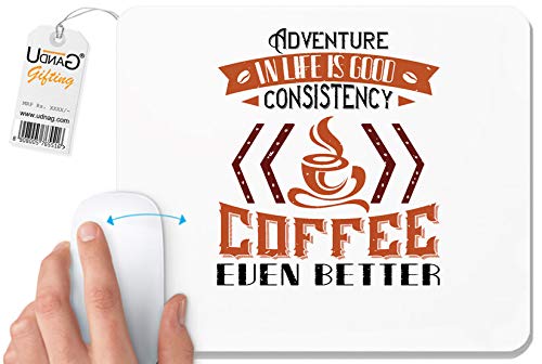 UDNAG - قاعدة ماوس بلون ابيض من يودناج بطبعة Adventure in Life is Good… Consistency in Coffee Even Better' للكمبيوتر واللاب توب مقاس 230 × 200 × 5 ملم، من يو دي ان اي جي، البوليستر