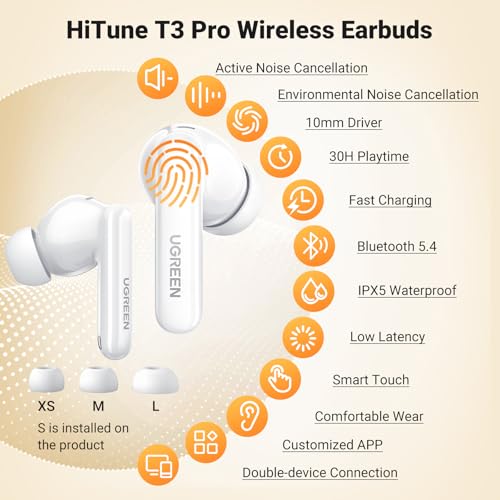 UGREEN - سماعات أذن هاي تون T3 برو بلوتوث 5.4 بخاصية إلغاء الضوضاء النشطة من يوجرين، 4 ميكروفونات بتقنية إلغاء الضوضاء المحيطة، مكالمات واضحة، وقت تشغيل 30 ساعة، مقاومة للماء IPX5
