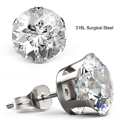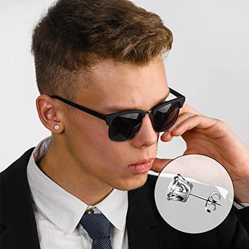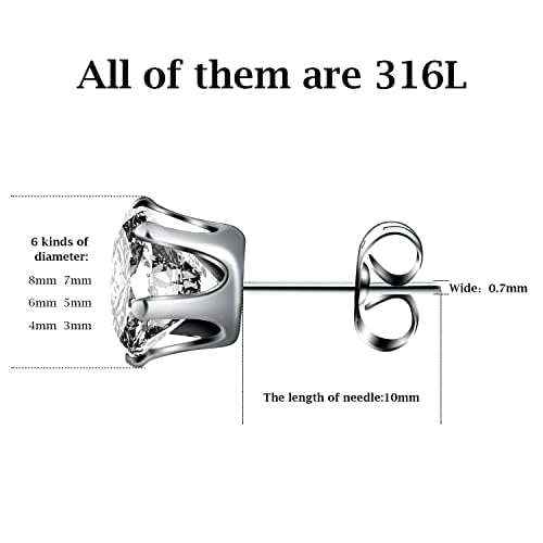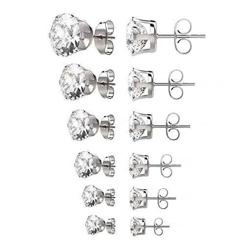 UHIBROS - 6 pairs Stud Earrings Set, Hypoallergenic Cubic Zirconia 316L Earrings for Men Women Stainless Steel CZ Earrings, 3-8mm, Alloy Steel, No Gemstone