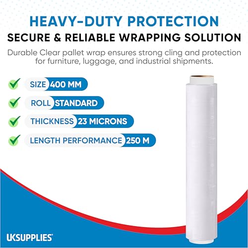 UK SUPPLIES LIMITED - 1 Roll, Clear Strong Multi Use Pallet Stretch Shrink Wrap 400mmx250m (20mu) I Tear Resistant I Easy to Use Pallet Wrap I Water & Moisture Proof Pallet Wrap Cling Film