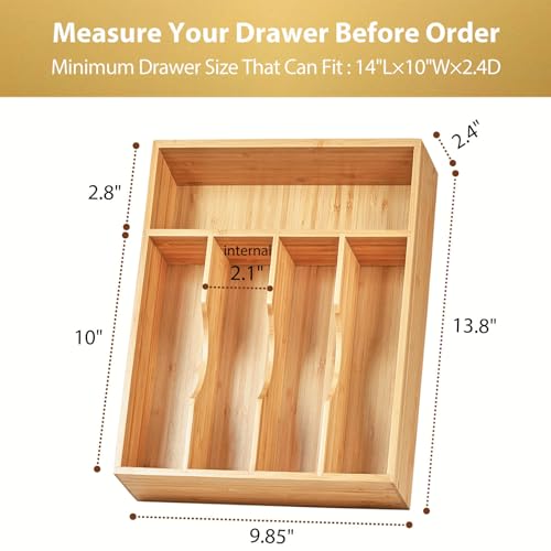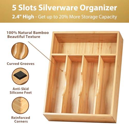 Umilife - اميليف منظم ادراج المطبخ حامل صينية ادوات المائدة الفضية مقاس 10 انش عميق للغاية مع اقدام غير قابلة للانزلاق ومقسم درج محزز علبة اجمالي 5 فتحات من خشب الخيزران لادوات والسكاكين
