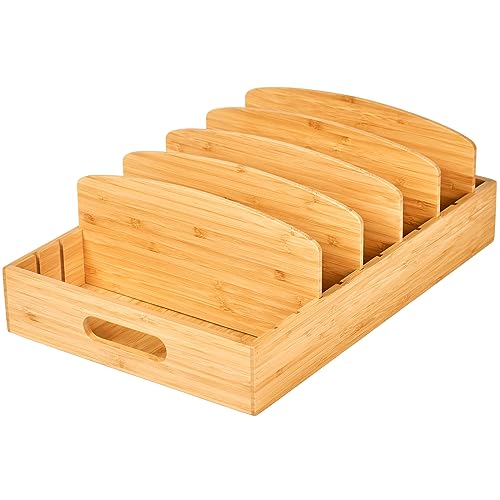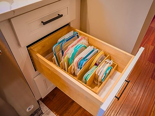 Umilife - اميليف منظم اغطية حاويات طعام كبيرة لخزانة المطبخ والادراج من الخيزران مع 5 فواصل طويلة قابلة للتعديل بلاستيكية لتنظيم وتخزين بني