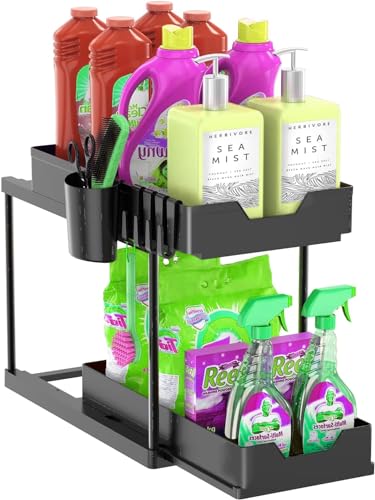 DILEASIR - منظمات تحت الحوض ومنظم حمام للتخزين، منظم سلة خزانة المطبخ المنزلق بطبقتين مع خطافات، كوب تعليق، فواصل مقابض، منظم رفوف تحت الحوض متعدد الاغراض