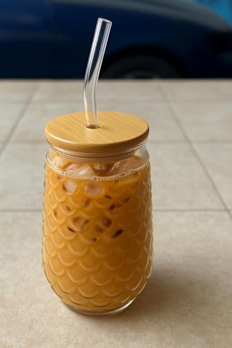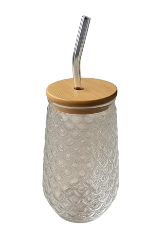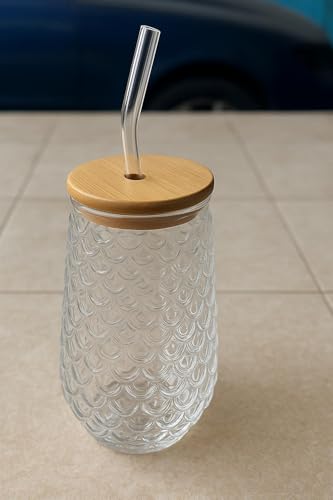 Generic - Unique Clear Glass Tumbler with Wooden Lid and Glass Straw – Embossed Design for Cold Drinks (2)